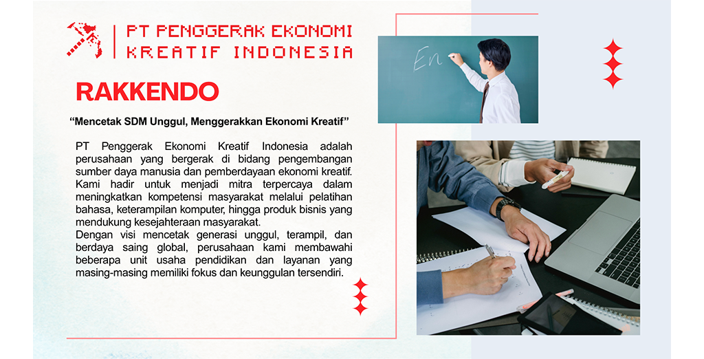 PT Penggerak Ekonomi Kreatif Indonesia berkomitmen untuk terus berkembang dan memberikan kontribusi nyata melalui pendidikan, pelatihan, serta layanan usaha yang berkualitas. Dengan semangat membangun SDM unggul dan ekonomi kreatif Indonesia, kami siap menjadi mitra terbaik untuk masyarakat, sekolah, perusahaan, dan institusi lainnya.